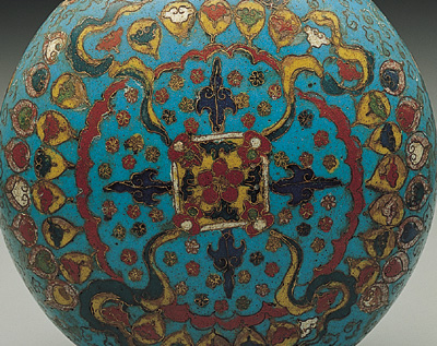 此景泰年间掐丝珐琅龙耳扁壶器内露胎,壶外整体铺天蓝地云纹锦,壶颈处用桃花与果实装饰,珐琅壶腹一面饰桃树花果,另一面周围装饰两圈桃形内含云纹、 中间开光处以五瓣花组成的装饰图案,整个纹饰安排与装饰犹如外销瓷,颇具西洋装饰风味;器侧饰五彩祥云,底铸去地阳文“景泰年制”方框、填黑篆书印式伪款。据推断此珐琅壶系十七世纪前期应市场供需所做的产品。