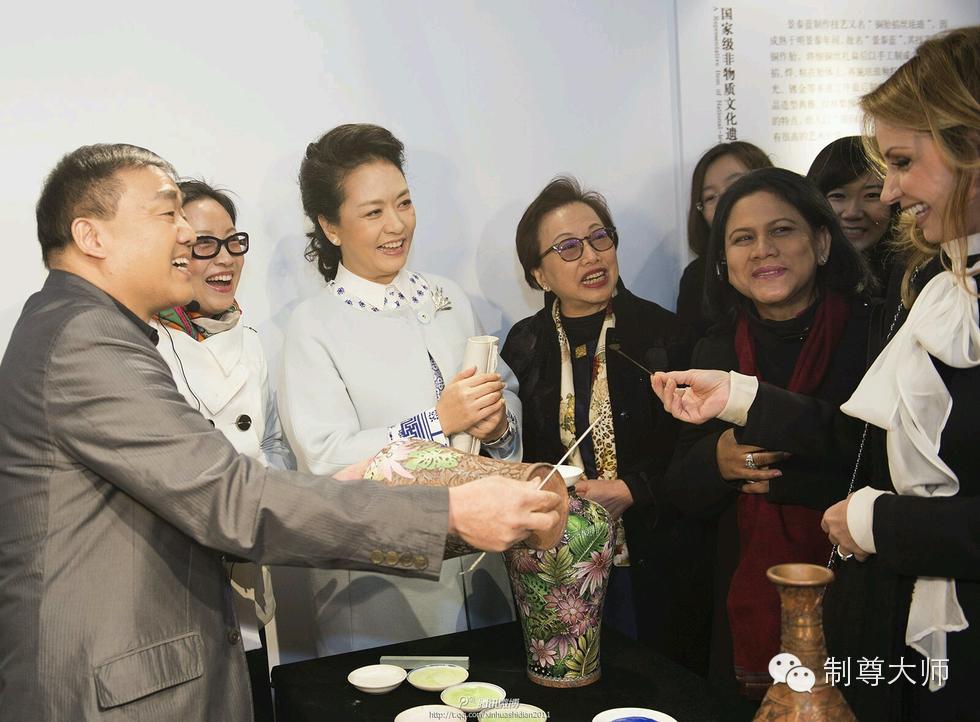 彭丽媛请夫人们体验景泰蓝的制作流程,尝试着为景泰蓝花瓶点蓝。夫人们纷纷惊叹景泰蓝工艺的精致和繁复。