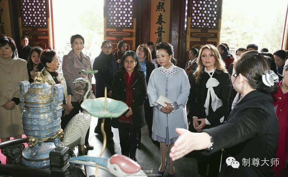 习主席夫人彭丽媛11日邀请来华出席2014年APEC领导人非正式会议的部分经济体领导人或代表的夫人参观世界文化遗产颐和园。颐和园是中国现存规模最大、保存最完整的古典皇家园林。在颐和园中参观并体验具有600多年纯正皇家血统工艺景泰蓝制作,自送韩总统景泰蓝后,此举在景泰蓝行业必将再掀景泰蓝收藏热潮。