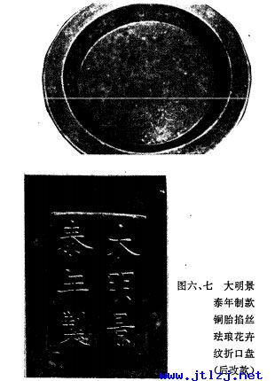 掐丝珐琅云龙纹菊瓣式口大盘,盘内饰彩釉二龙戏珠,其间布施如意云纹。口边饰缠枝菊花纹。外底施浅蓝釉地,彩花缠枝莲纹,中心处以如意云头装饰成长方框栏,框内贴铜镀金长方形薄片,上刻双龙环抱“大明景泰年制”款。该作品的造型和图案风格均为万历时期特点,原珐琅釉烧制的“大明万历年制”款,已被镀金铜片所掩盖。这种做法显然也是清人所为。