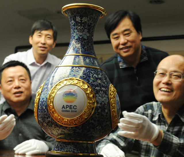 2014年,在北京APEC期间,《四海升平》景泰蓝赏瓶送给各经济体领导人。三件国礼分别是《四海升平》景泰蓝赏瓶、《繁花》手包套装、《和美》纯银丝巾果盘,前者为领导人礼品,后两者为领导人配偶礼品。
