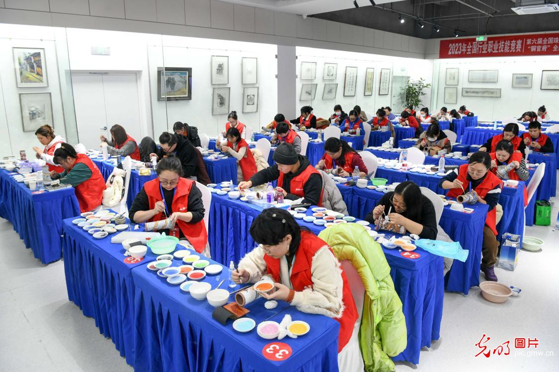 图为参赛选手在景泰蓝铜胎上进行点蓝。(过仕宁摄/光明图片)
