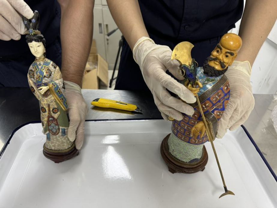 近日,上海海关所属上海邮局海关在对进境邮件进行监管检验时,发现一票申报内容为“景泰蓝人物摆件”的邮件机检图像异常,遂对邮件进行开拆查验,邮件内除陶瓷制人物躯干2件外,人物头部、手掌5件配件表面光洁、纹路自然,疑似象牙制品,拼接完成后两尊景泰蓝人物摆件造型精致、风格古朴(景泰蓝人物金陵十二钗欣赏)。